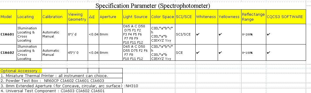 portable spectrophotometer not only can help to perform color matching and color management studies, but also can control product quality management accurately. The instrument is equipped with high-end color management software which can connect PC to achieve more extension functions. CIA602 Spectrophotometer with 45/0  CIA602 spectrophotometer is developed by KKI with independent intellectual property rights.It uses 45/0 geometrical optical structure, comply with CIE No.15, GB/T 3978. With human body engineering mechanics and humanized operation design, NS800 has stable performance precise measurement and powerful functions in the leading position of the same industry. With 400~700nm, NS800 spectrophotometer features with high accuracy DeltaE*ab 0.04, and 8mm aperture makes measurement so easy. It can save 1000 Standards, 15000 Samples and you also can input your own LAB or XYZ value into the instrument. With SQC8 software,  you can do better color control management. Plus, it is widely used in plastic, electronic, paint, ink, textile, garment, printing and dyeing, food, medical, cosmetic, industries, scientific research institutes, schools and...