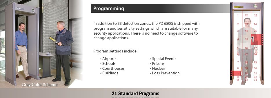 The PD 6500i leads the industry with superior pinpoint technology and unmatched discrimination features. Designed for maximum throughput without compromising security, the PD 6500i is the walk-through of choice for security professionals worldwide.
