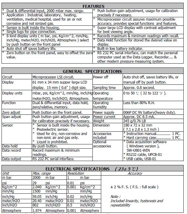 LUT0068 DIGITAL MANOMETER 2000 MBAR/HPA - 9100